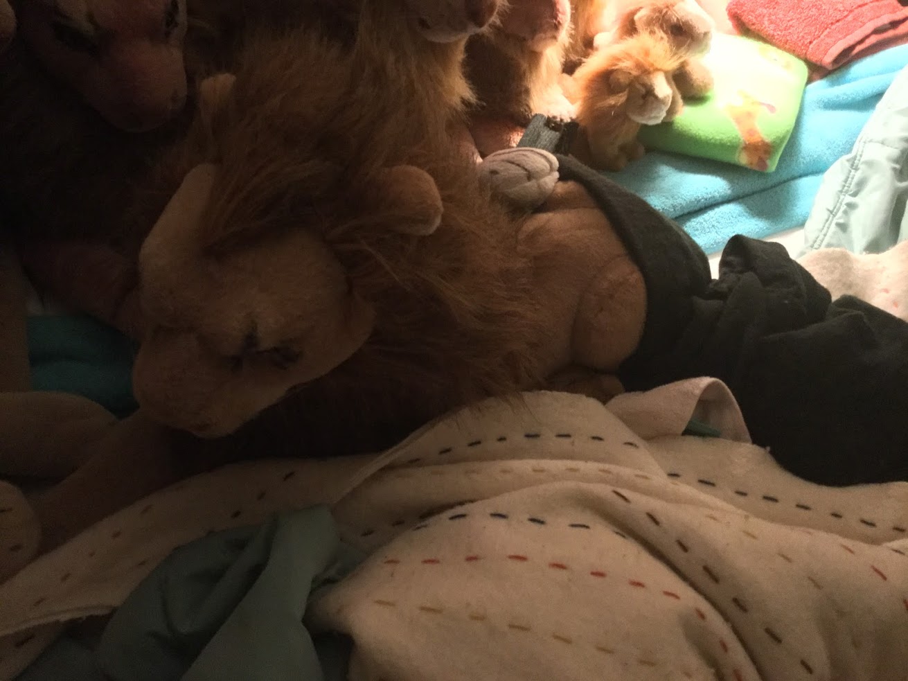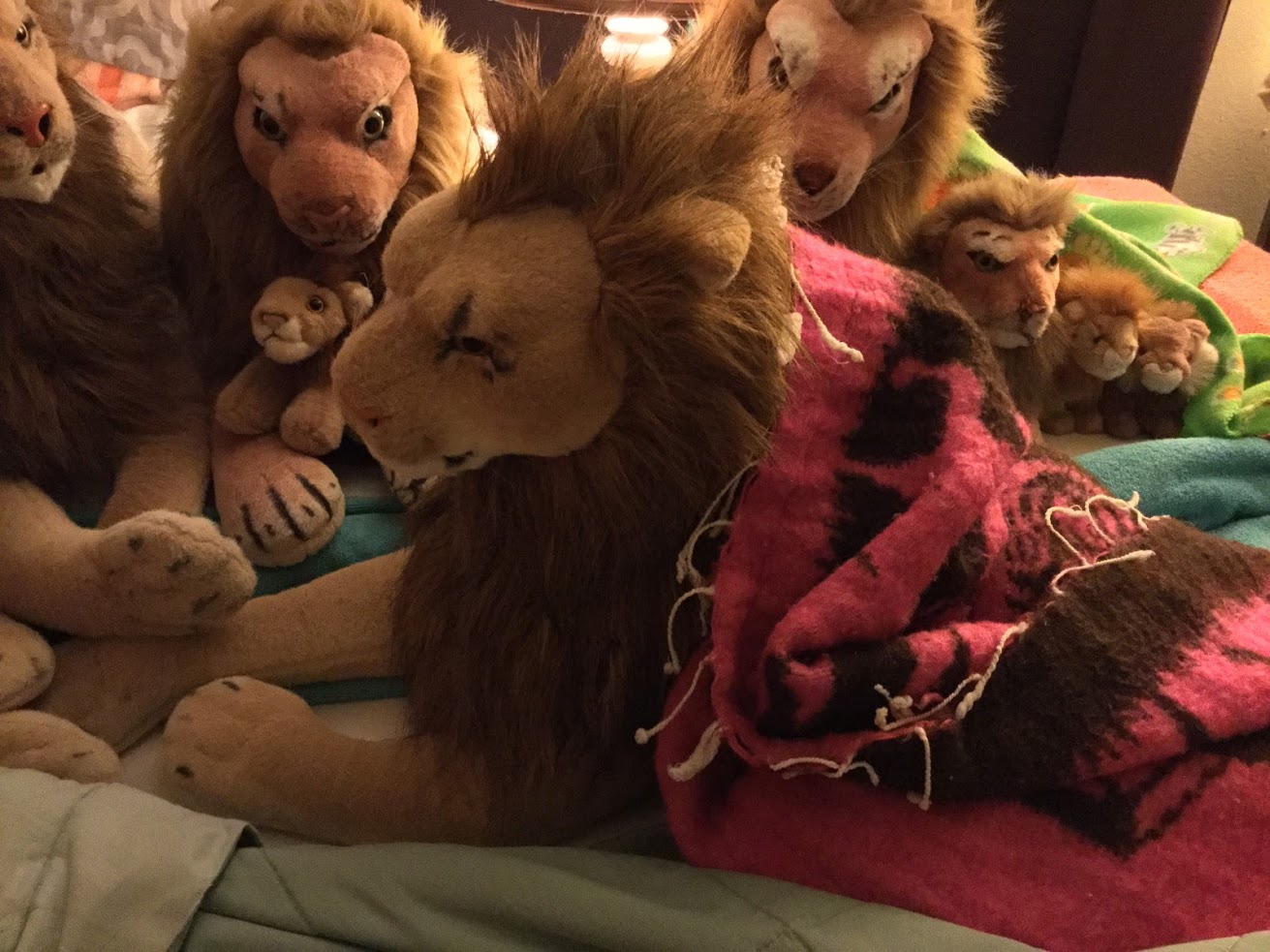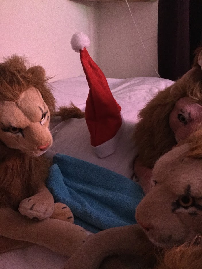 Vaak vind ik de leeuwen in grappige posities, die schijnbaar door mijn eigen nachtelijke bewegingen worden veroorzaakt. Soms echter denk ik stiekem dat er misschien wat meer aan de hand is, Rob bezig? Zo slaagt de Peace Bor leeuw er altijd in de lichte deken of bijvoorbeeld mijn poncho of sweater, die daar toevallig liggen, om zich heen te wikkelen, alsof iemand hem heel precies en netjes voor de nacht toegedekt heeft. Ik geef u mijn woord dat ik dat niet deed. Het Whiskers leeuwtje hangt soms op zijn kop tussen de andere leeuwen op een manier die erg grappig te noemen is. En afgelopen november 2017 vond ik opeens een “erecte” Kerstmuts die rondslingerde, die ochtend dat ik wakker werd stond hij kaars rechtop, en ik zweer u dat ik het niet deed. Deze kerstmutsen zijn uitermate zwak (lees: goedkoop gemaakt) van structuur dus dit was echt wel heel typisch. Het was een van de kerstmutsen die ik ontving toen de jaloerse Rob leeuw arriveerde. En recentelijk vond ik het Afrikaanse Rob leeuwtje alsof hij aan het vliegen was geslagen.