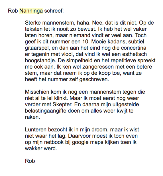 Om dichtbij Rob te blijven wil ik nu een paar emails geven die Rob en ik uitwisselden over muziek. Toen ik in 2009 Rob, om redenen die inmiddels duidelijk mogen zijn, vroeg om een liefdesliedje, was hij me daarin een paar keer van dienst. De eerste stuurde hij me op 13 mei 2009: