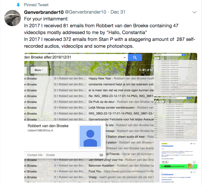 Beide mannen slaan zichzelf regelmatig op de borst dat ze zulke uitstekende helderzienden zijn en beide hebben me ook in 2017 als bezetenen gemaild Het is nu 2018 en er is daarin nog maar bar weinig veranderd. Stan kan grappig uit de hoek komen. Zo verklaart hij mij met enige regelmaat de liefde en zei zelfs een aantal keer dat hij verliefd op me is. Zijn standaardkreet is: “Ik mag je ondanks alles.” Stan is een gladde prater op eenzame hoogte, van een bijna legendarisch niveau dat de meeste mensen zelfs nooit in hun leven zullen tegenkomen. Hij heeft ook zijn echtgenoot in dit alles betrokken en die zong zelfs een liedje voor me.