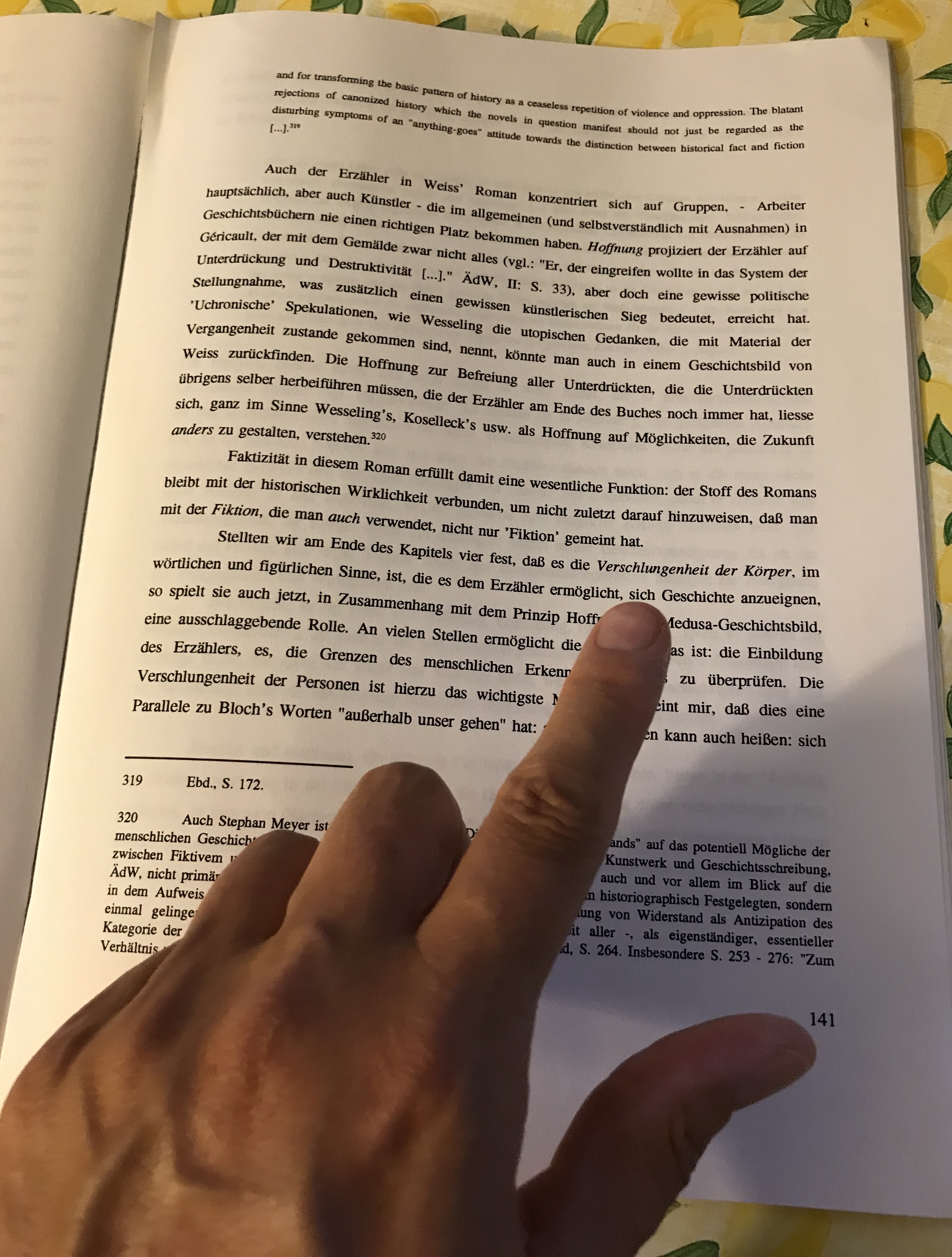 Het plan dat ik al in gang had gezet – ik had zelfs al Helmut Lethen geëngageerd als PhD begeleider – gaf ik slechts na een paar maanden al weer op, ik had immers al zo lang gestudeerd en kon het niet meer opbrengen, nog vier jaar langer. Maar ik wilde dit hier wel noemen, omdat het verstrengelings-fenomeen, maar dan op een meer literaire, kunstzinnige manier, dus al vroeg mijn interesse had gewekt.