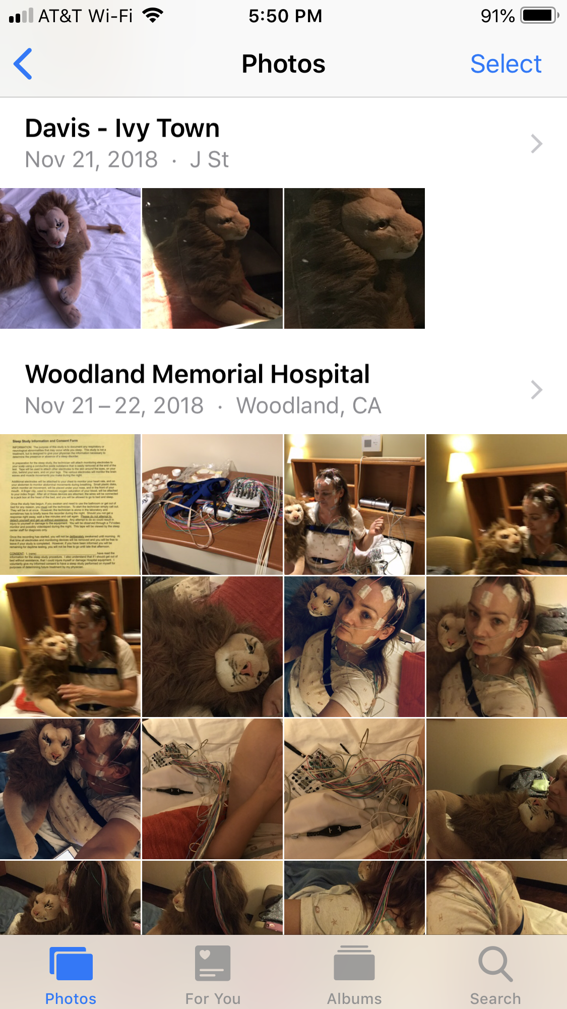Aangezien er slechts zeven foto’s voor de hier beschreven fotoreeks in mijn iPhone te vinden zijn, moet ik de fotogalerij kort voor november 2018 opgeschoond hebben. De eenzame zeven foto’s bestaan uit drie foto’s van parende leeuwen, een paar selfies, een foto van een kip die ik maakte bij de UC Davis Domes gedurende een van mijn fietstochten en een Strava kaart van de fiets-artiest Stephen Lund die in maart 2018 een beeld van een uil-fietsroute creëerde, en deze datum werd trouw zo opgepikt door mijn iPhone.