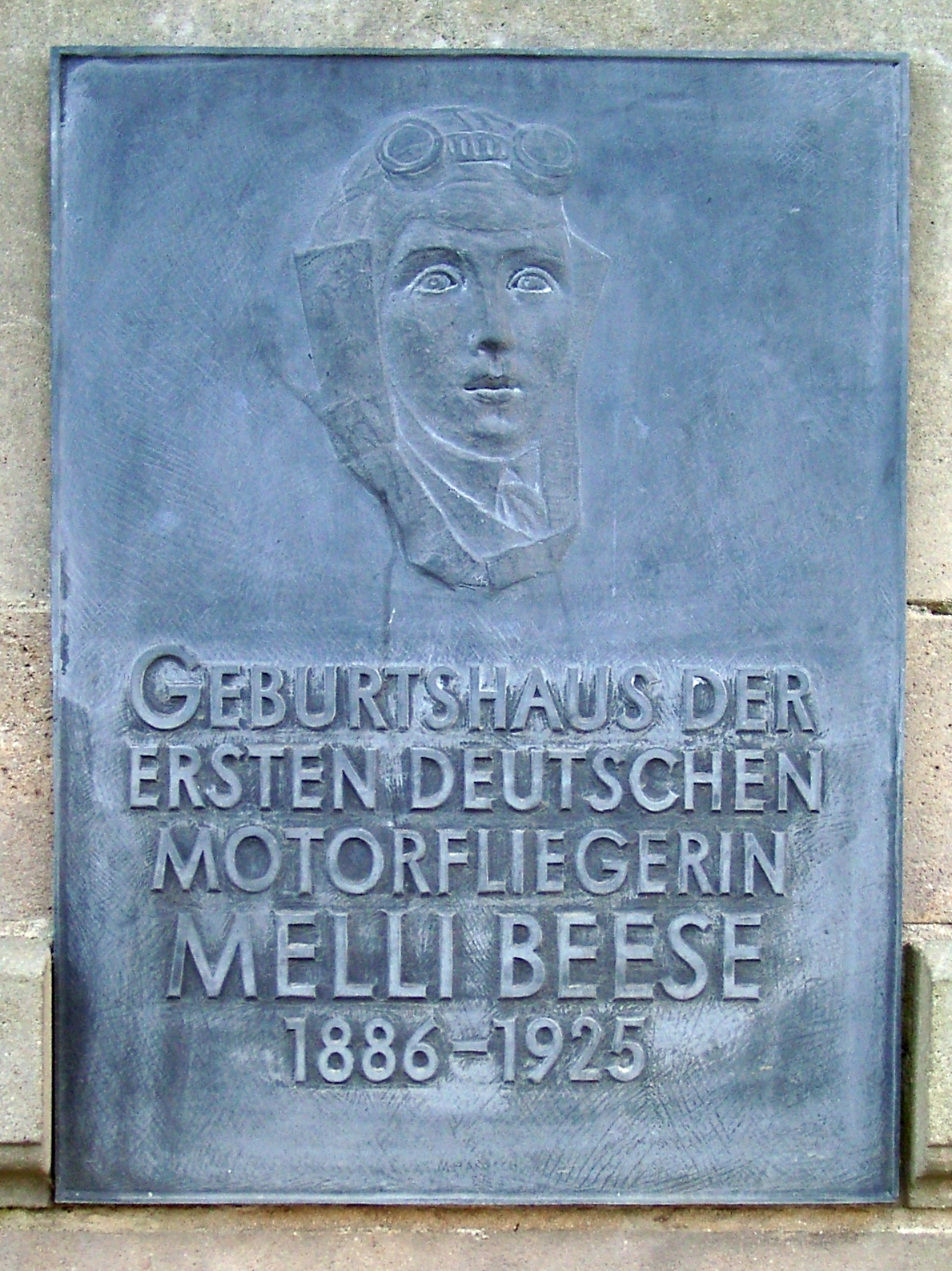 Gedenkplaat bij de geboorteplaats van Melli Beese in Dresden-Laubegast. De inscriptie luidt “Geboorteplaats van de eerste Duitse vrouwelijke vliegtuigpiloot.” (Tekst Wikipedia)