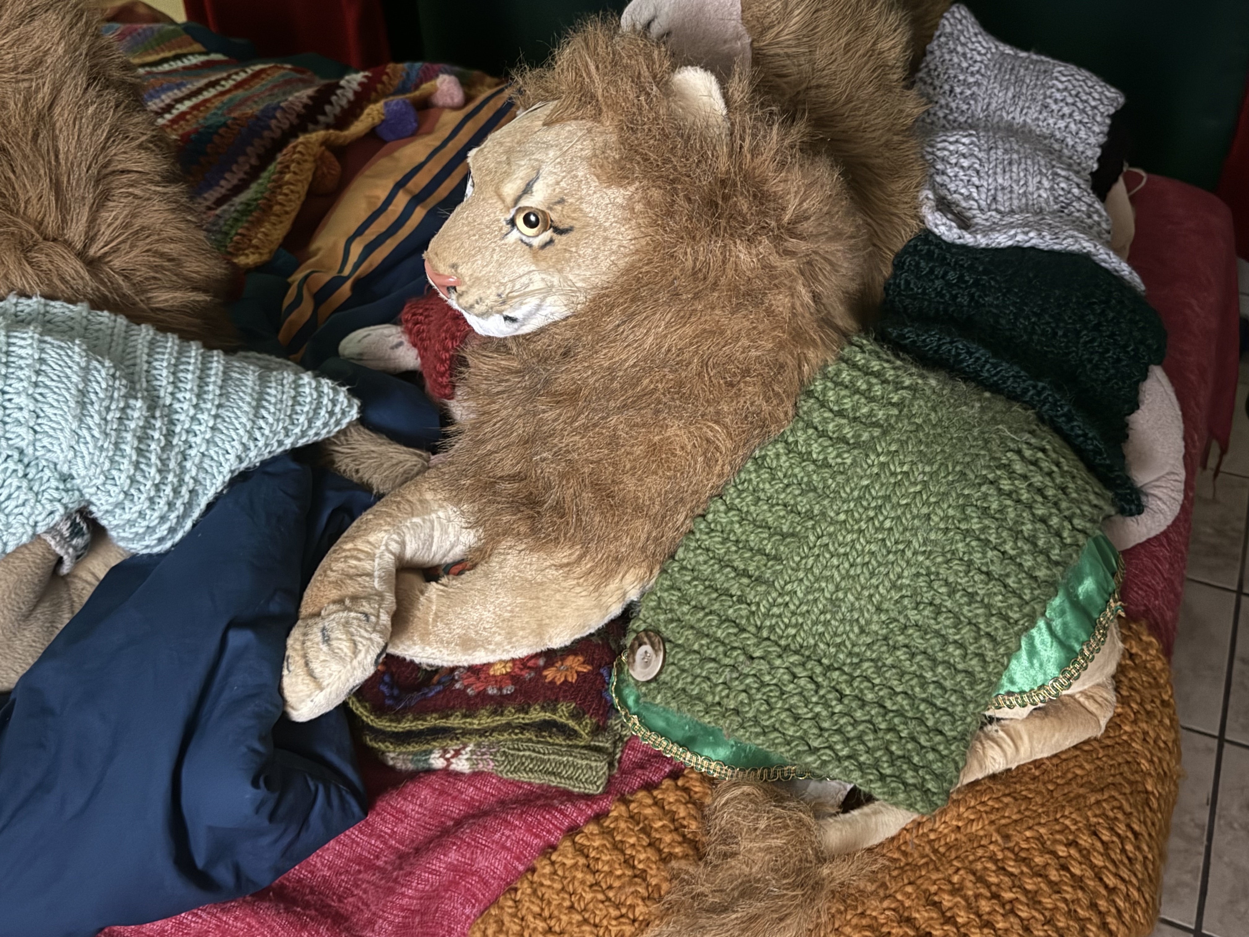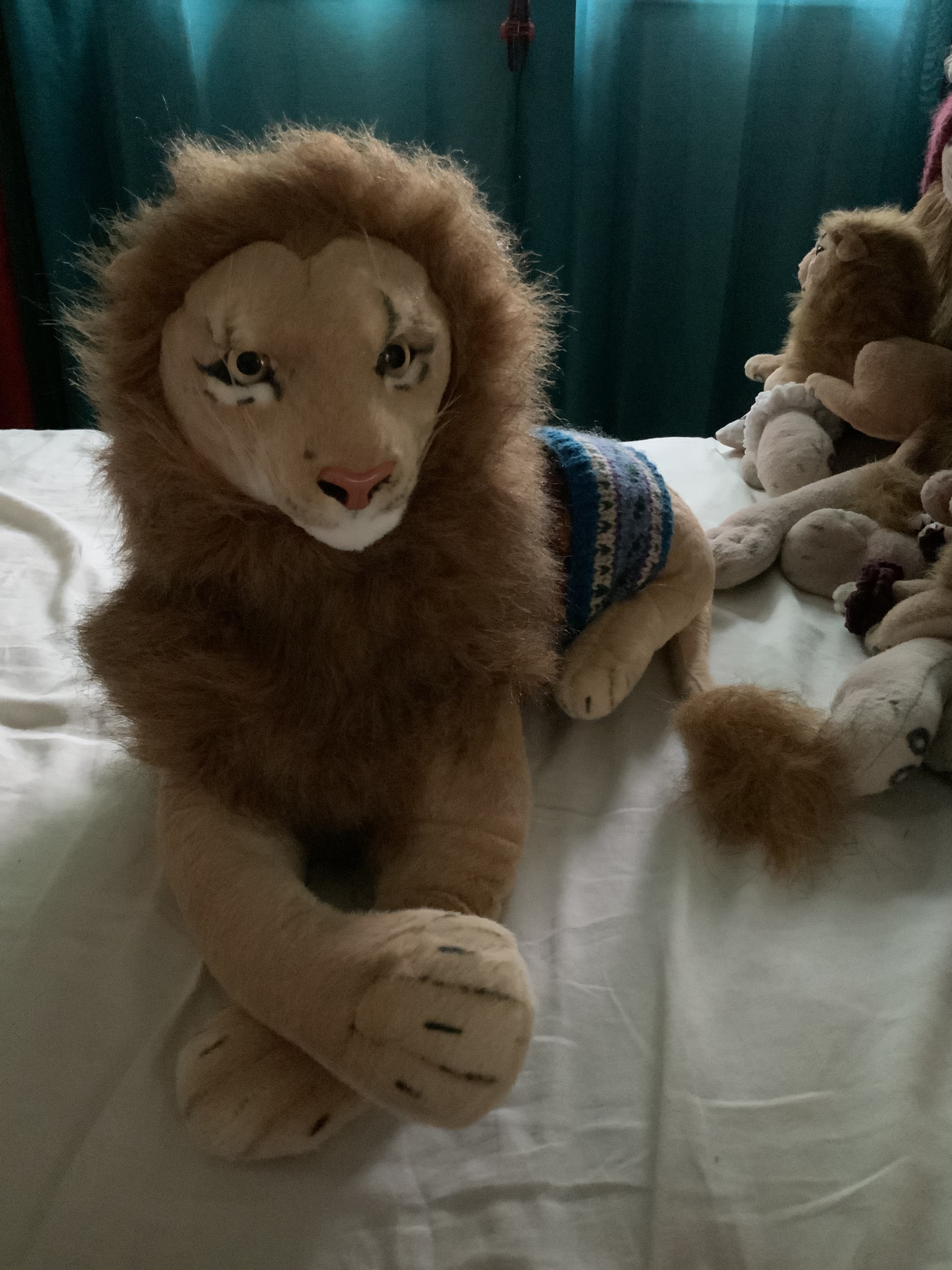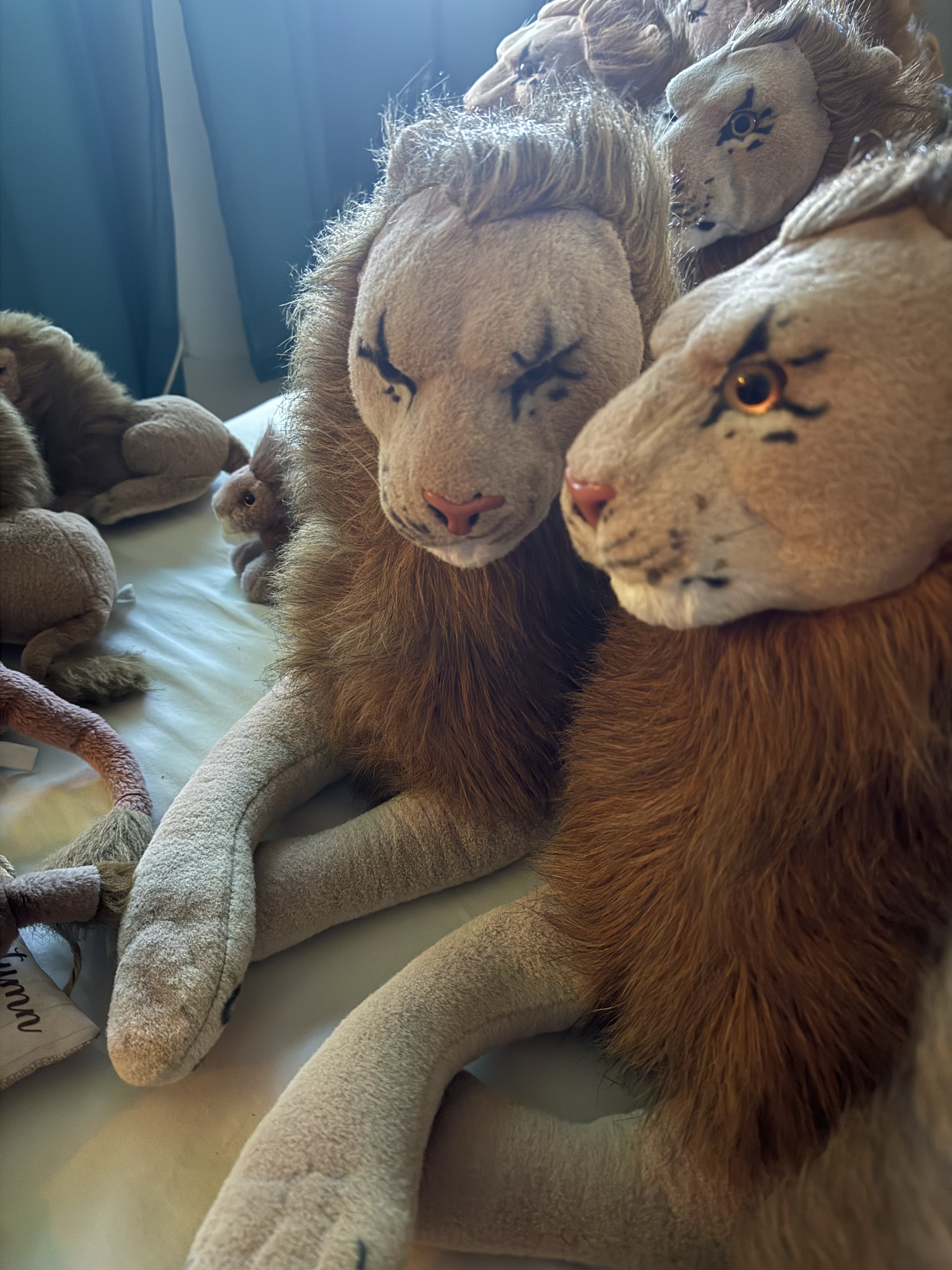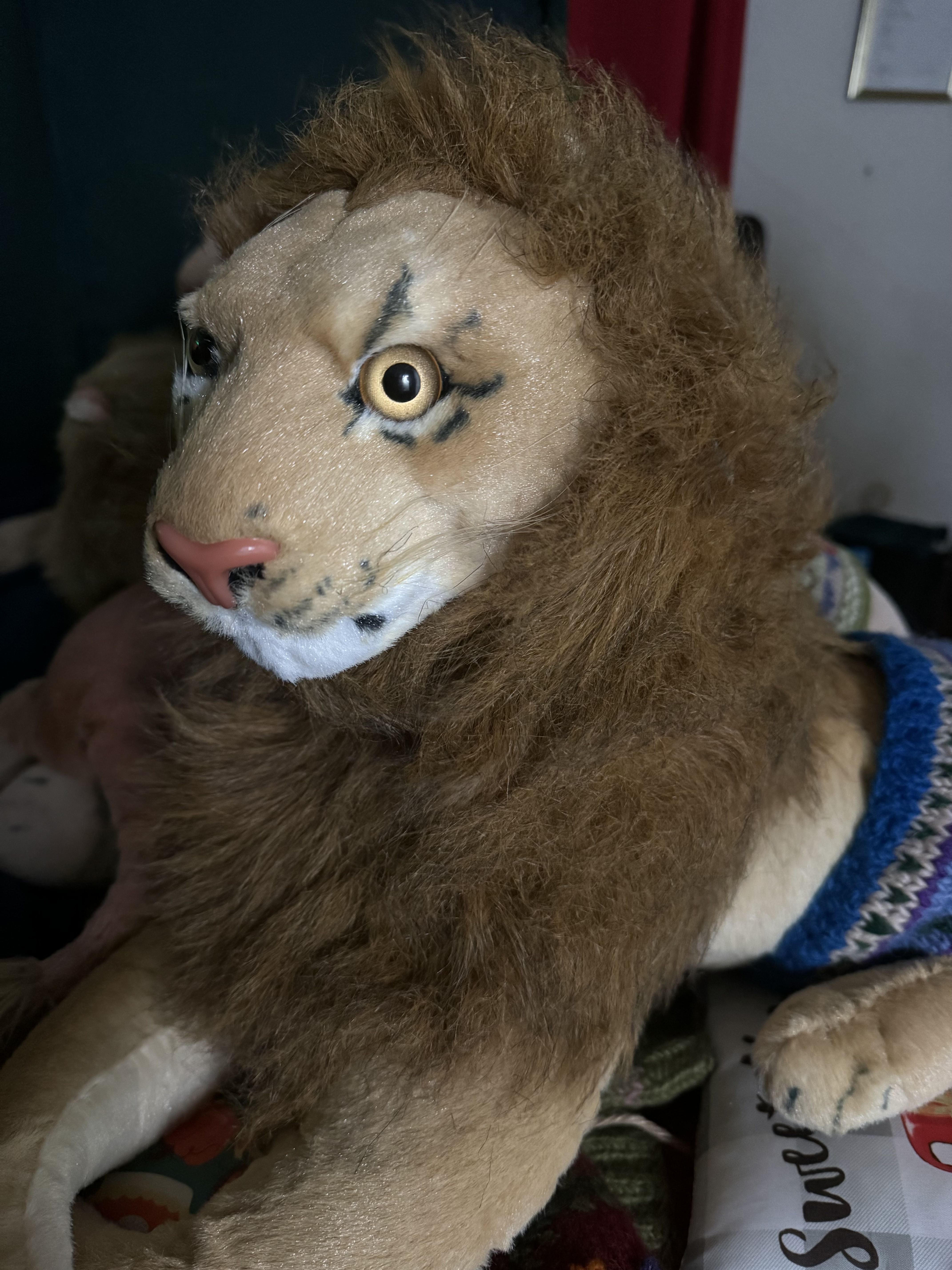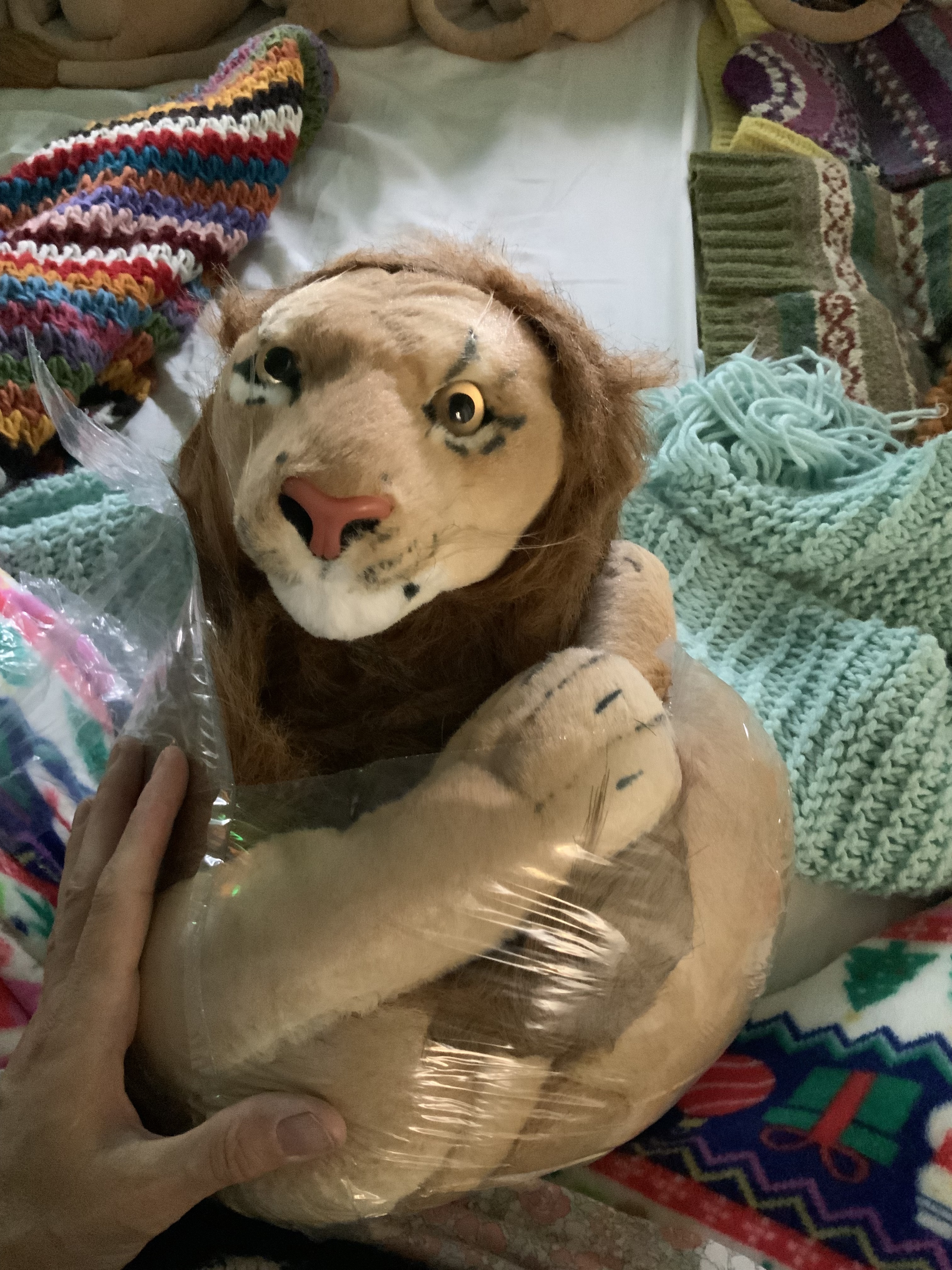 Voor de nieuwe, steeds moeilijker te vinden, Rob inner crew leeuw moest ik nota bene naar Ali Express, die een verkoper onder de vleugels heeft die ze nog verkoopt. Vol spanning wachtte ik de zending direct uit China af en toen ik op een dag nietsvermoedend in mijn mailmand keek en daarin een compacte ronde bal verpakt in plastic zag, dacht ik verward: “Huh, had ik kleren besteld, dat kan ik me niet herinneren.” Het volgende moment drong met een schok tot me door: “Het zal toch niet de leeuw zijn?” Met een kreet van afschuw over zijn verzendlot liet ik de leeuw ter wereld komen door voorzichtig met een schaar het intens strakgespannen plastic open te knippen. Ook de vorige leeuwen waren uit plastic gekomen en de analogie met een bevalling was altijd al treffend. Hij kwam er wat verkreukeld toch nog met een wonderbaarlijk laag schadeniveau uit. Ik borstelde hem, deed alles om hem weer mooi te maken en dat lukte! Hij is extreem zacht, met peilende ogen en een gevulde nek en rug, prettig massief en perfect passend in mijn omhelzing. To Be Continued